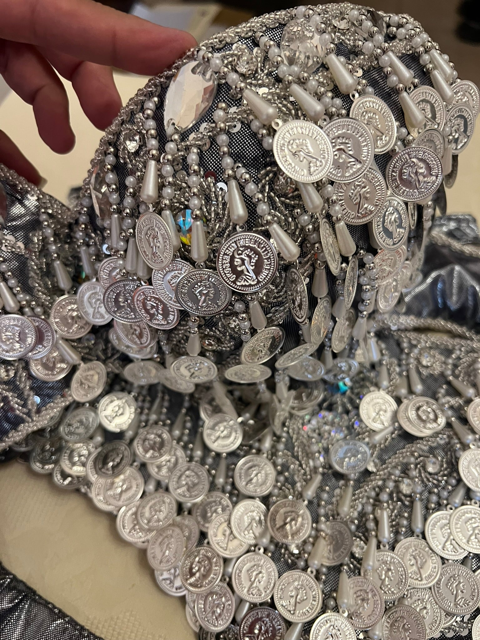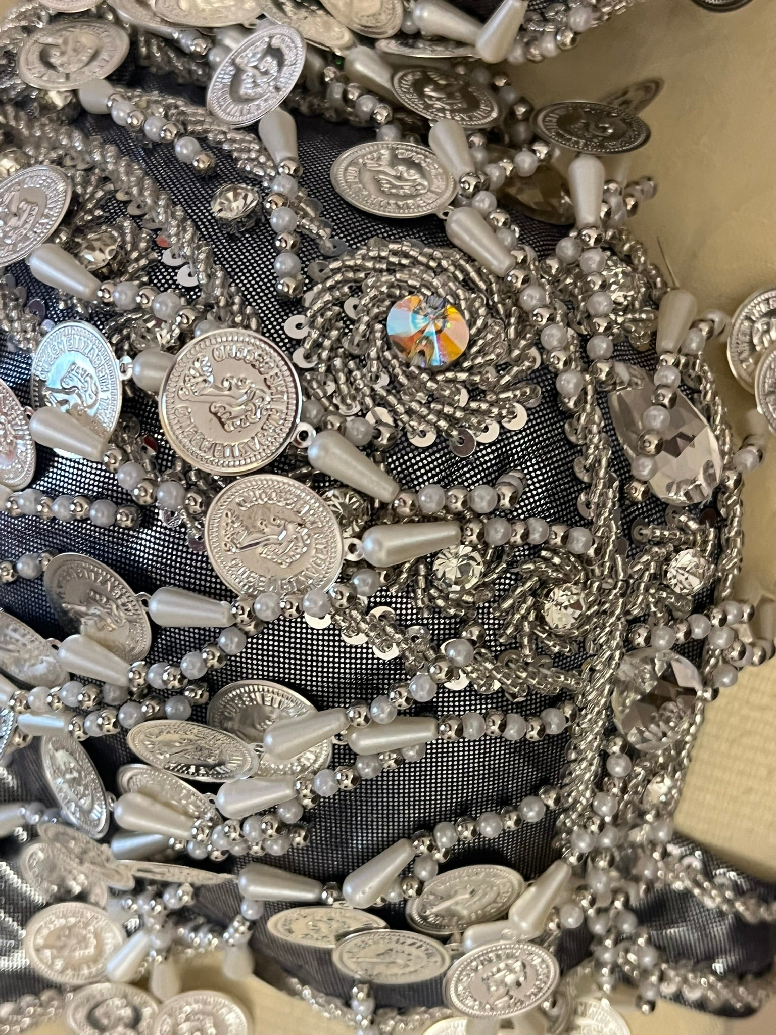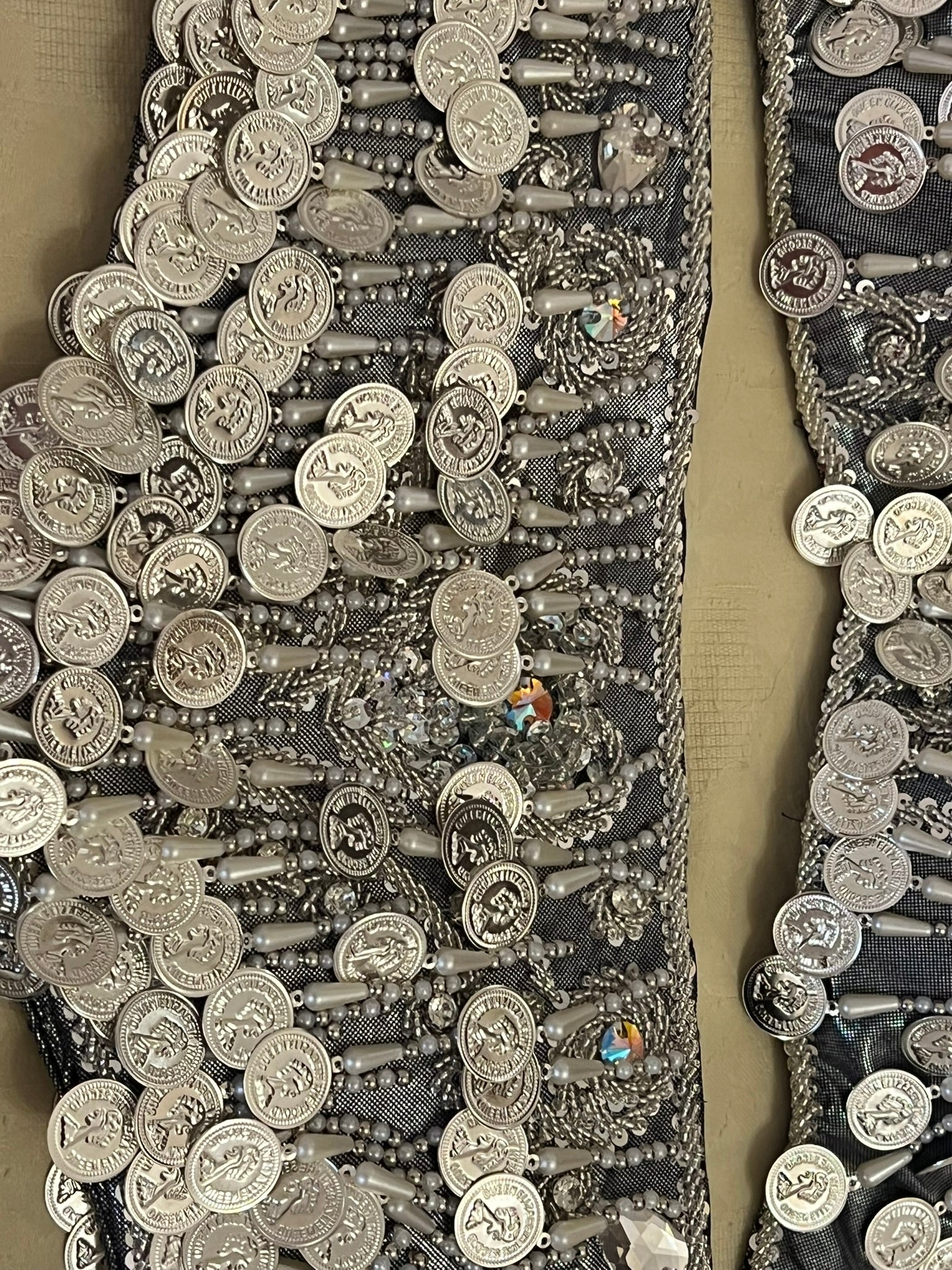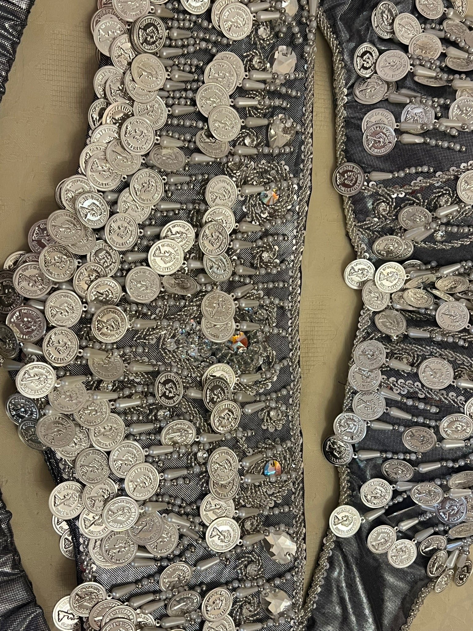 - Hand-embellished details: Adorned with shimmering glass beads, metal sequins, and sparkling glass stones for maximum stage impact.