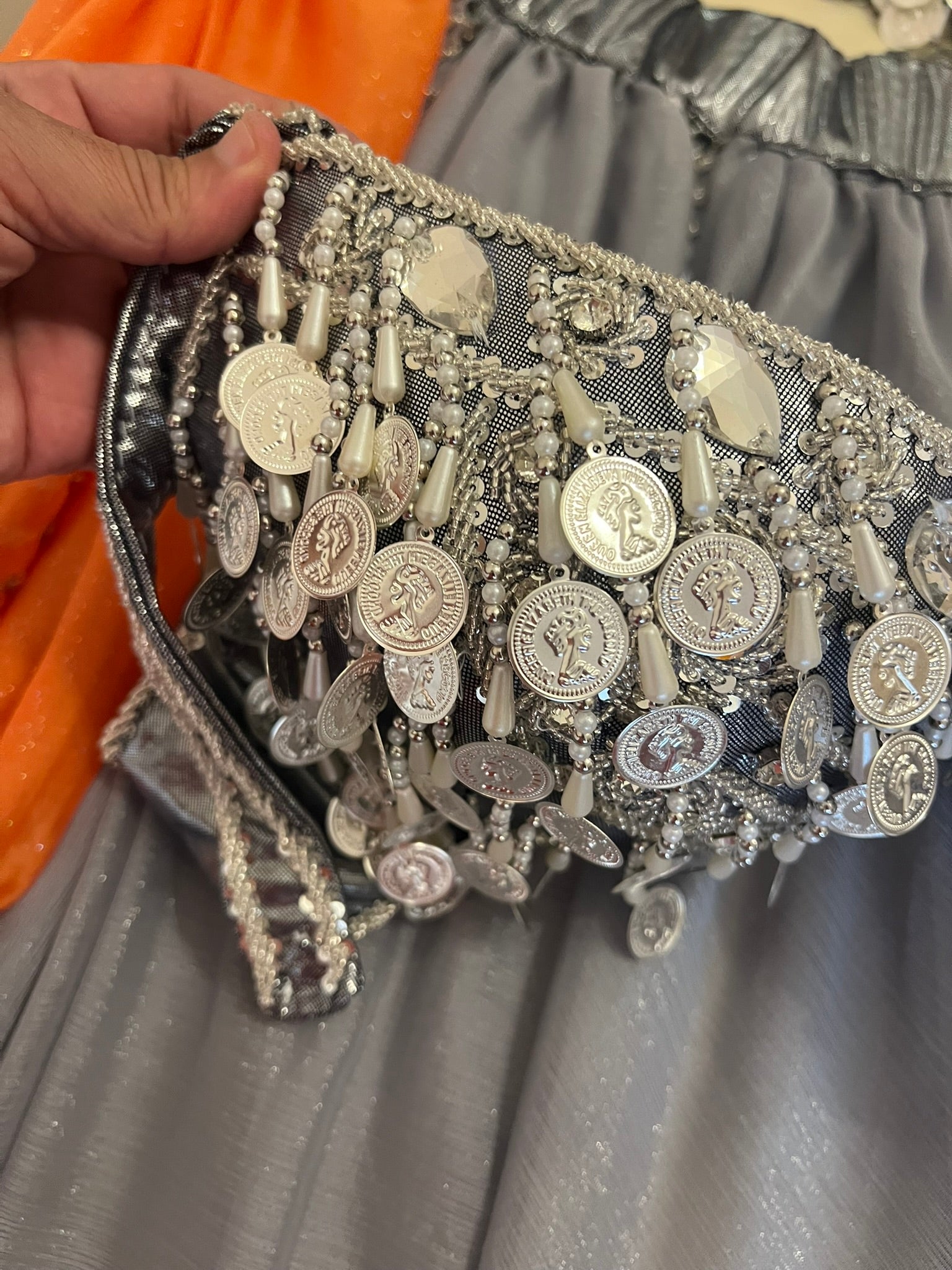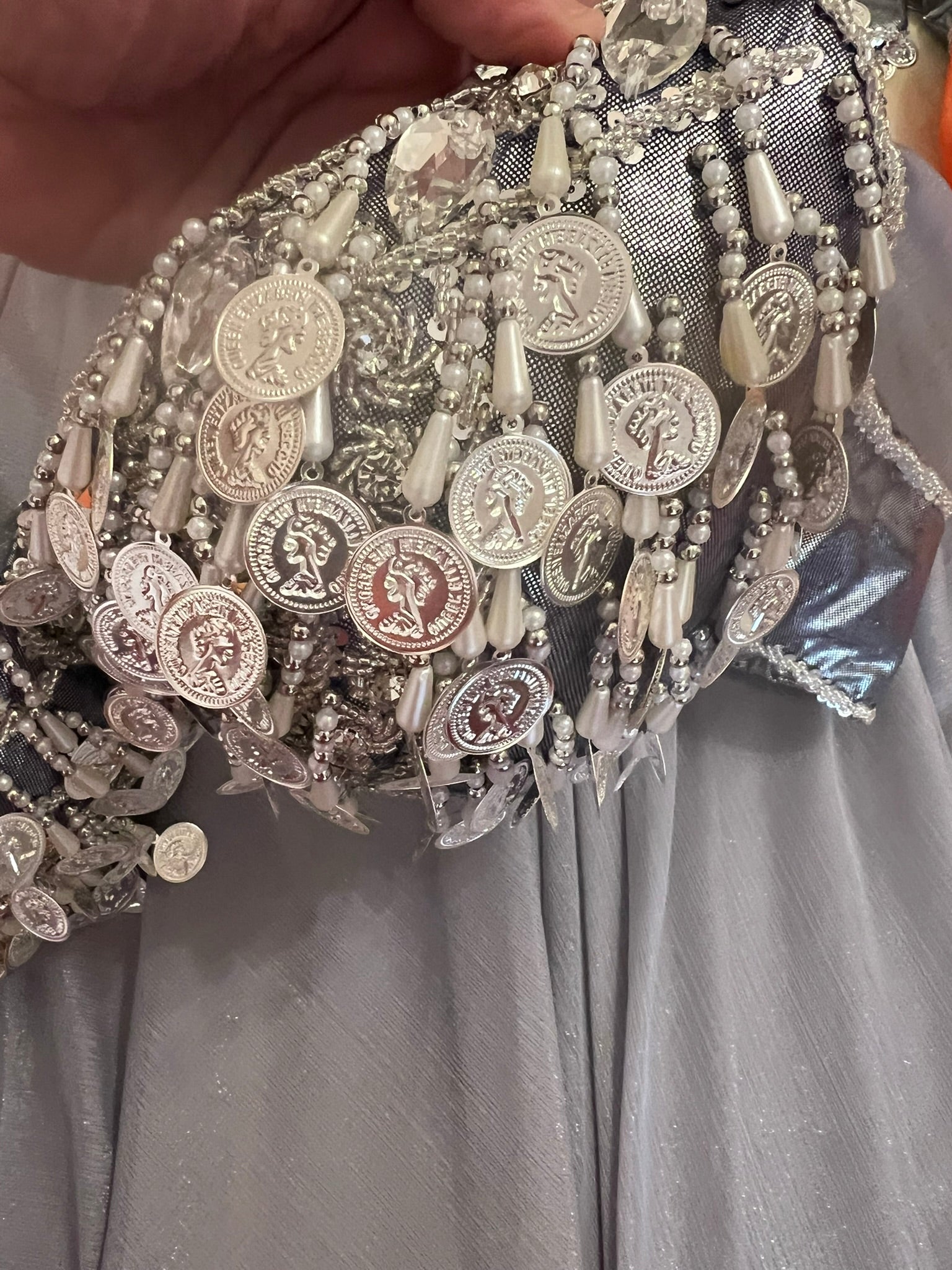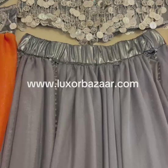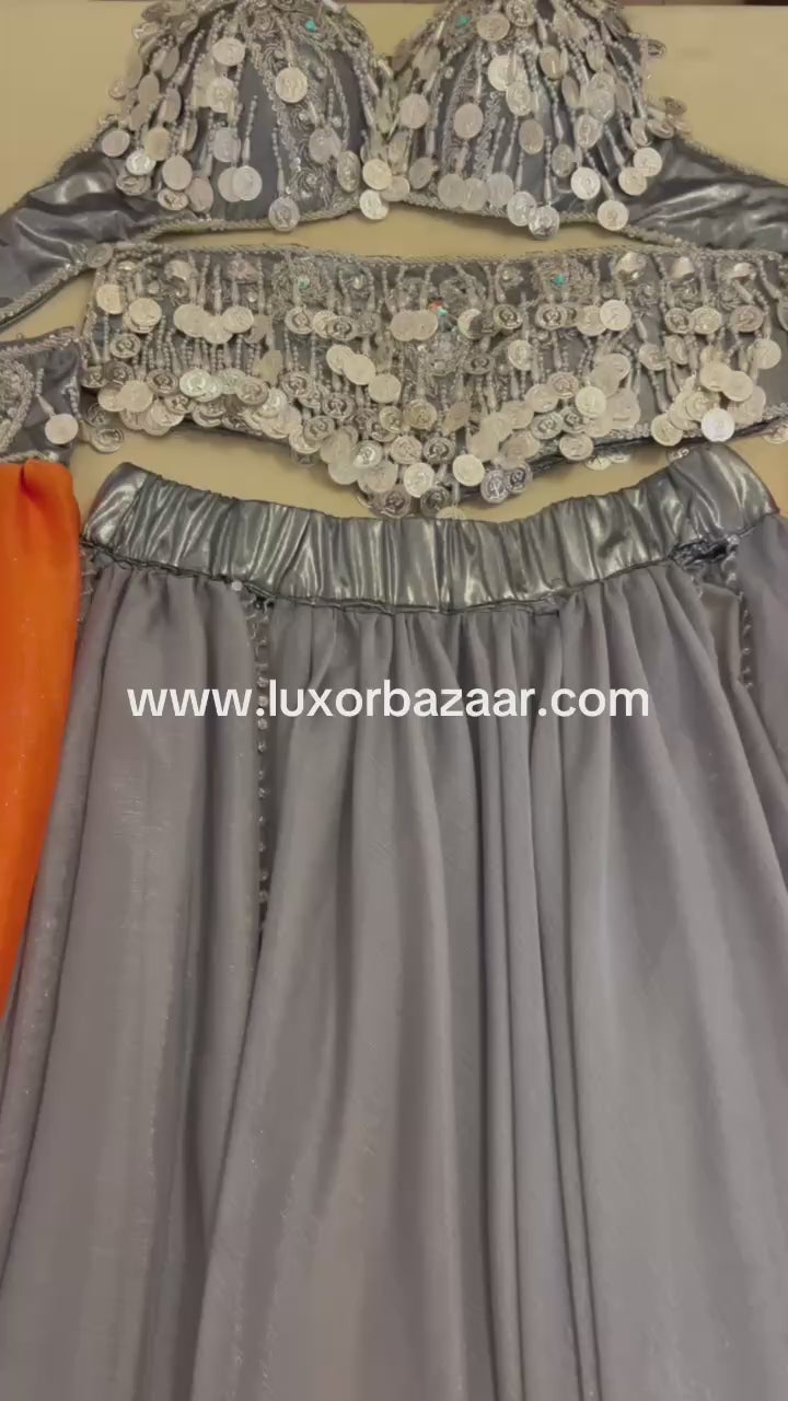 Professional Silver Belly dance costume, Dancing belt, skirt, Bra and sleeves ensemble